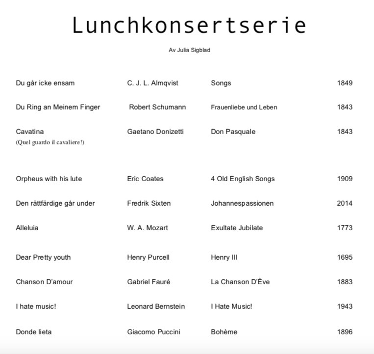 "Lunchkonsert" - Ett samarbete med Clara Hjelm Wester där egenskrivna låtar spelas upp för första gången.
